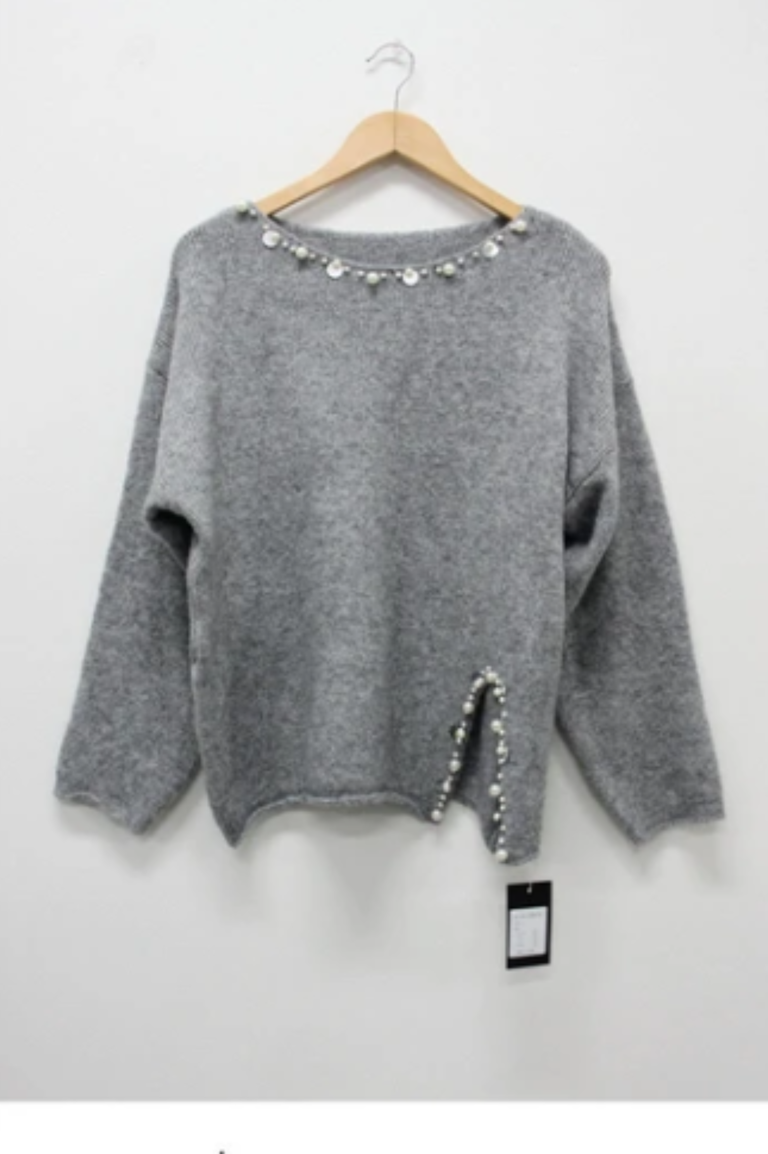 襟元と、トップスの裾のスリット周りのビジューがとてもお洒落で女性らしい、デザインです。