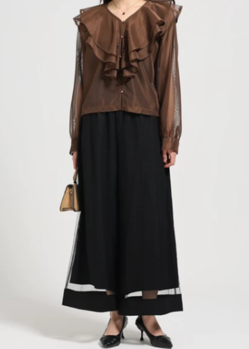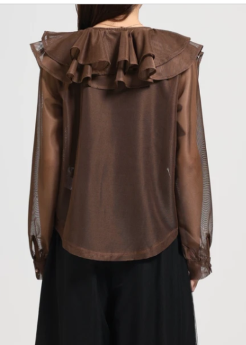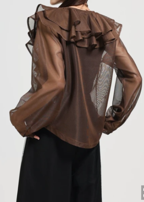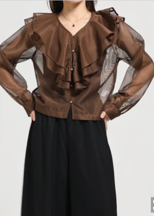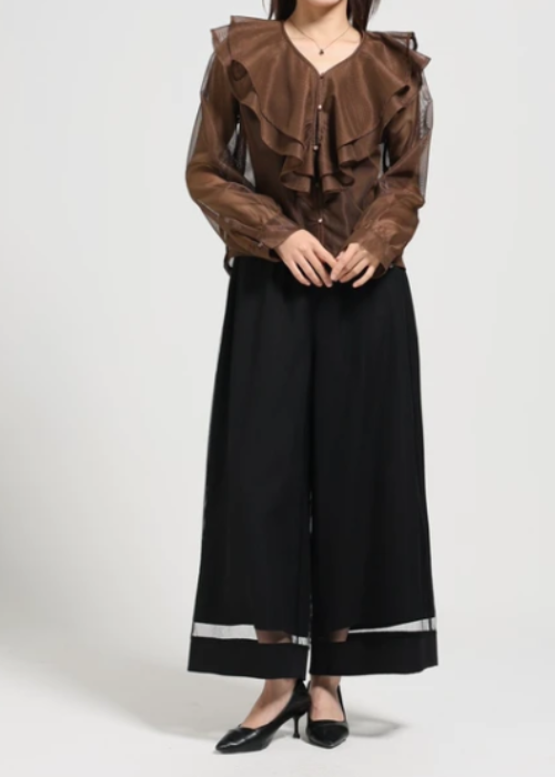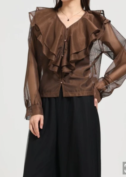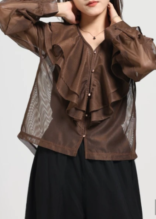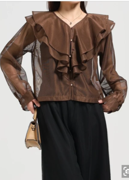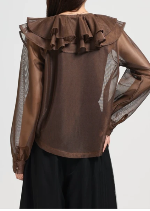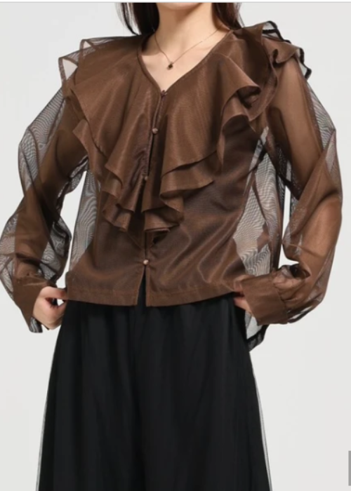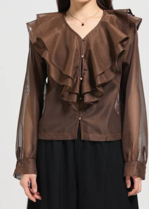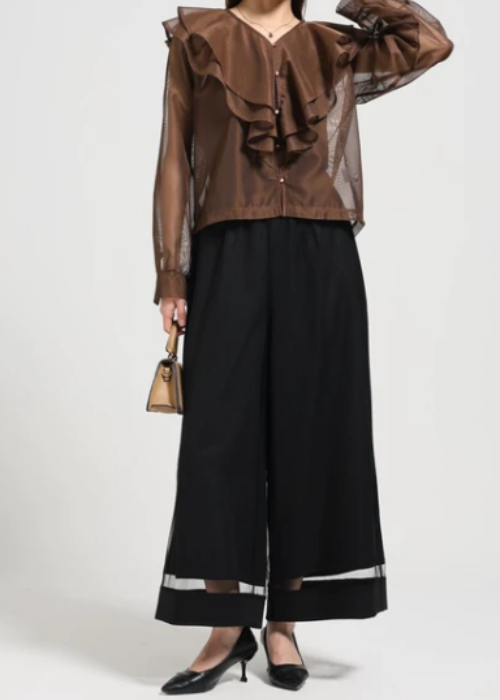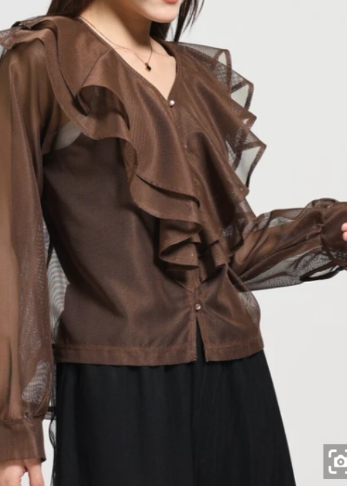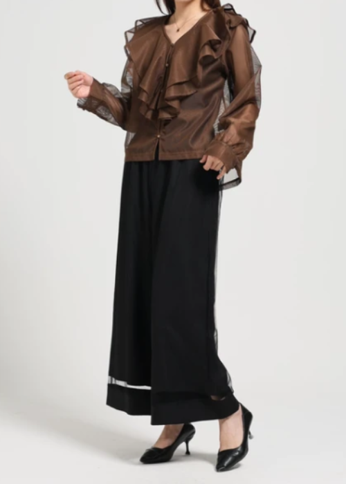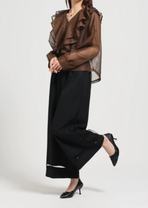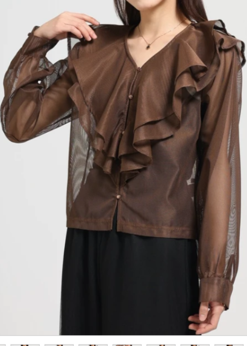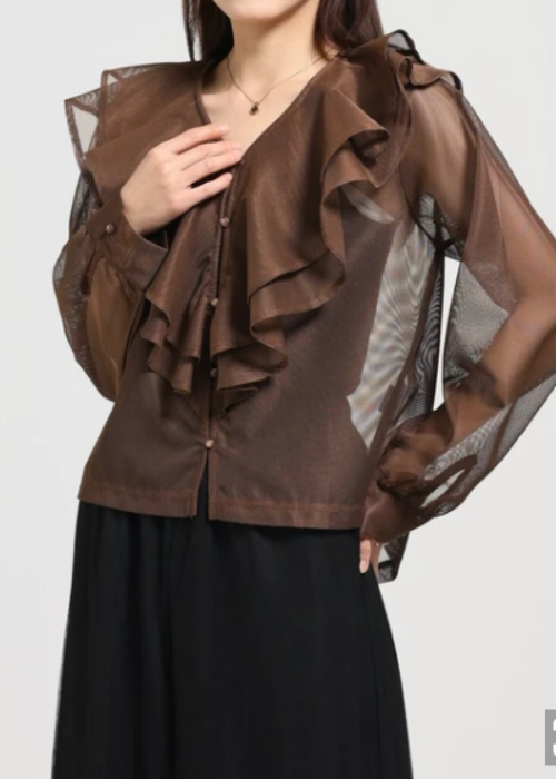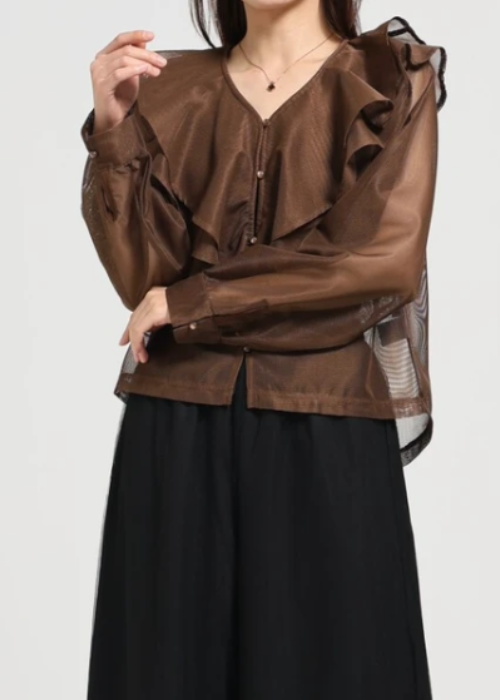 軽やかなシアー素材に、フロントへ流れるように重ねたフリルが華やかさを添える大人フェミニンなブラウス。 フロントボタンで着脱しやすく、スカートにもパンツにも合わせやすい万能デザインです。 オンオフ問わず着回せる一枚で、春先から秋口まで長く活躍します。 この春はbrownもトレンドカラーです。 |