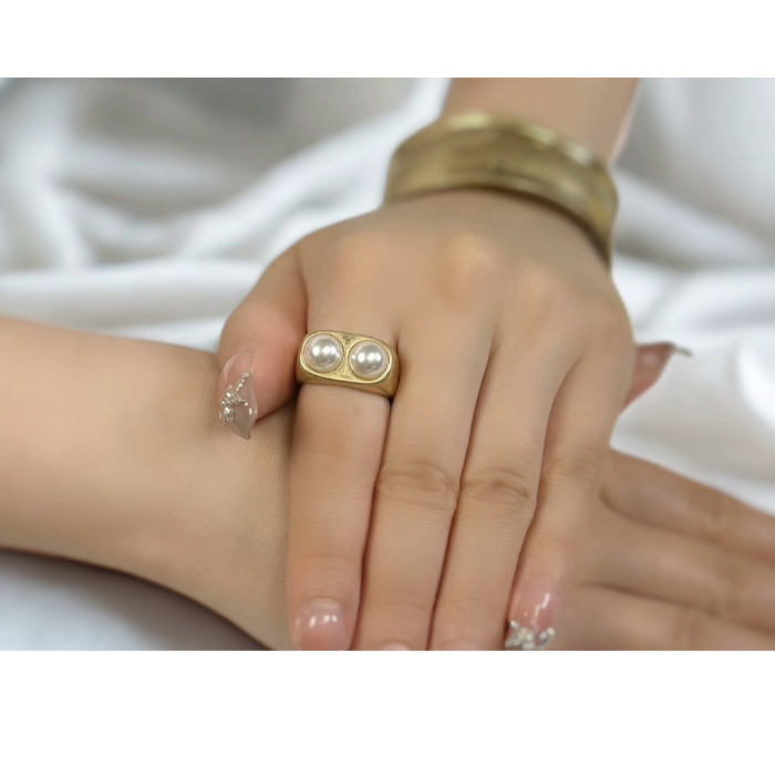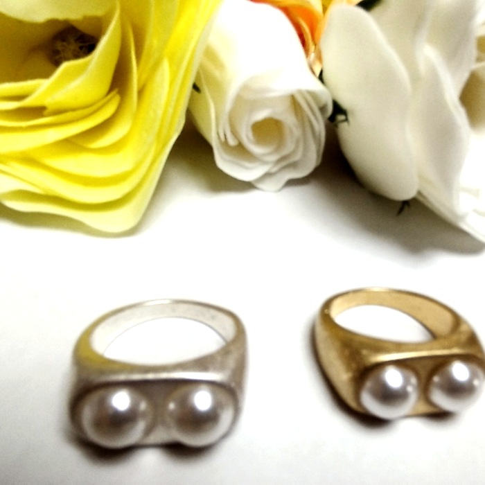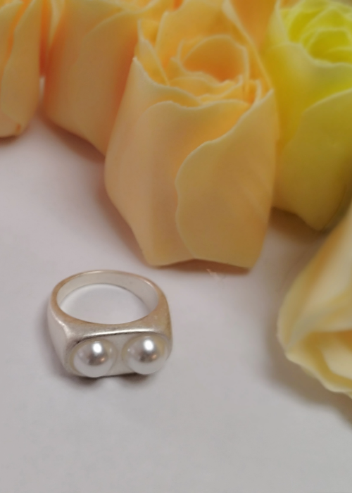 フロント部分がスクエアの平になっていて、フェイクパールが2つ埋め込まれている、個性的でありながらエレガントな指輪です。