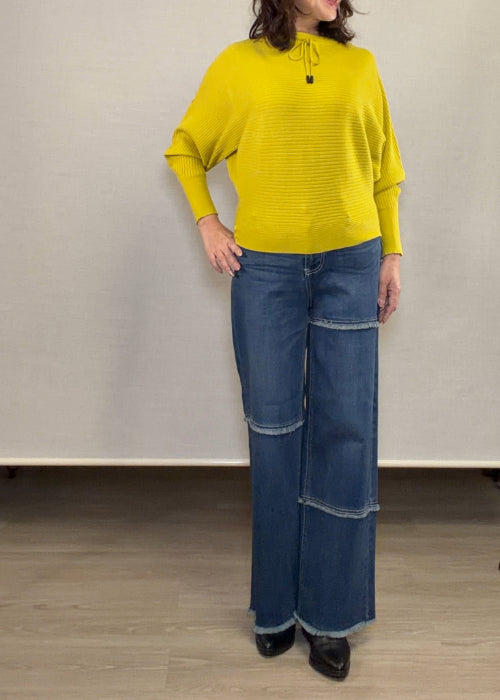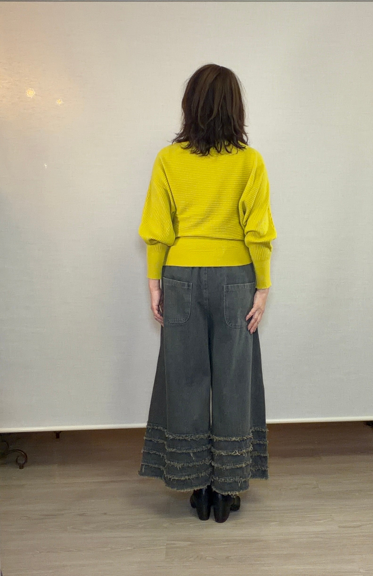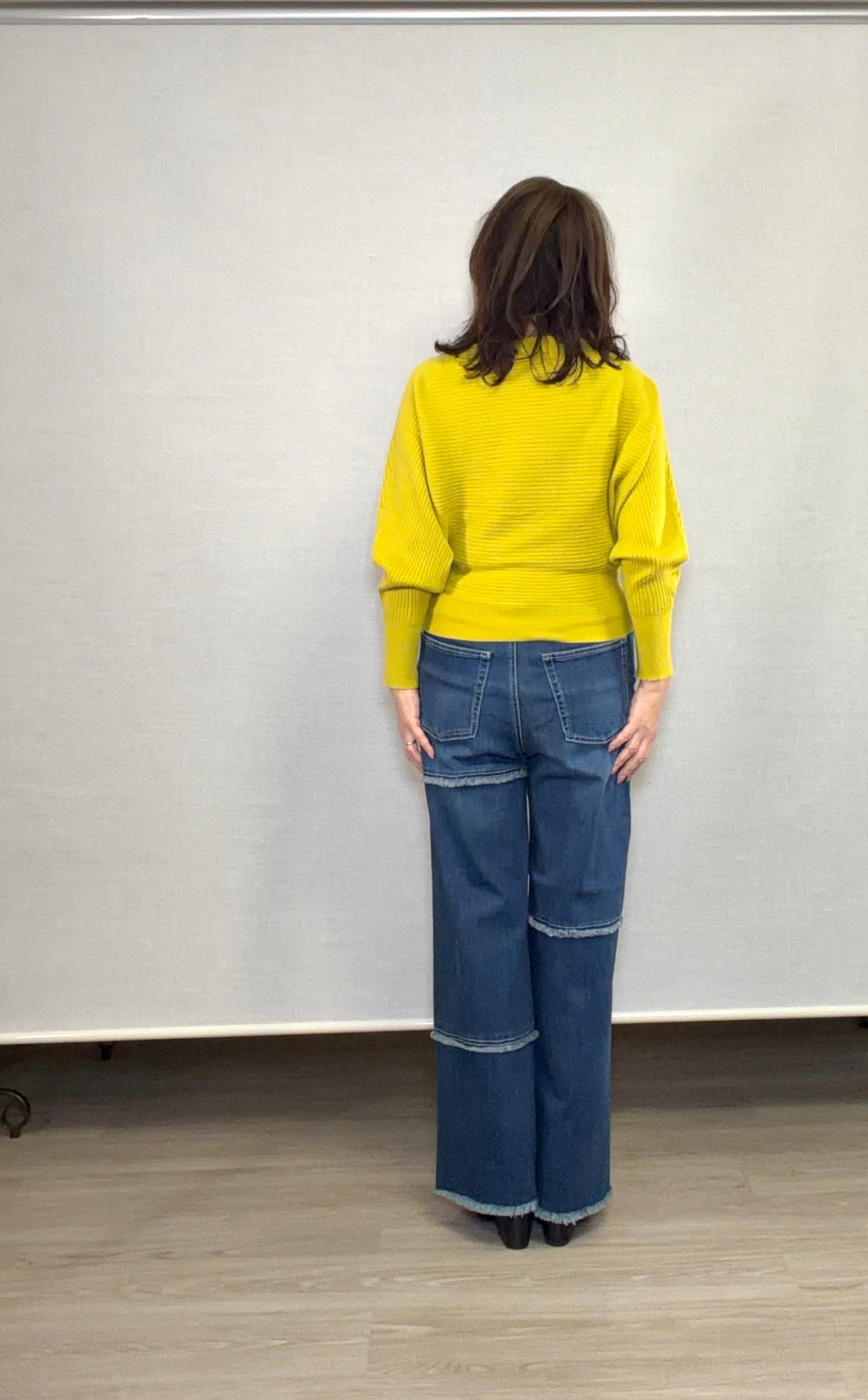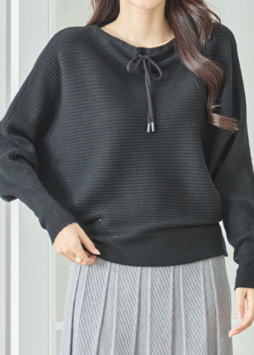 襟元にリボンがついて、アクセントがついたハイゲージのドルマンスリーブセーター